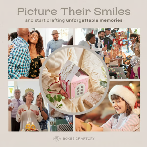Jokainen joululahja sisältää enemmän kuin vain sisällön – se sisältää rakkautta, iloa ja muistoja. Tämä joulumökki-lahjarasia ei ole vain pakkaus, se on osa lahjaa. Se on suunniteltu juhlavan pienen talon kaltaiseksi, ja siinä on seppele ovessa ja sydämenmuotoinen ikkuna, ja se tuntuu kuin olisi tuonut onnea suoraan joulupukin kylästä.