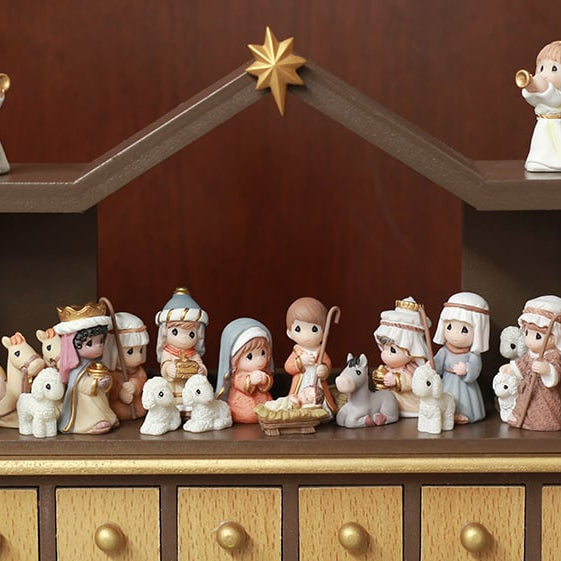Paketissa on kaikki mitä tarvitset herkkään jouluperinteeseen: viehättävä puinen arkku, jossa on numeroidut laatikot (kansissa söpöt pyöreät nupit helppoa avaamista varten), puinen tallipöytä ja kokoelma käsinmaalattuja kylmävalettuja hartsihahmoja – ajattele Mariaa, Joosefia, Kristus-lasta, kolmea kuningasta lahjoineen, enkeleitä trumpetteineen, paimenia, eläimiä ja paljon muuta. Lisäksi seimivihko, jossa on riimittelyjä jokaiselle adventtipäivälle, lisää tarinankerronnan viehätystä.